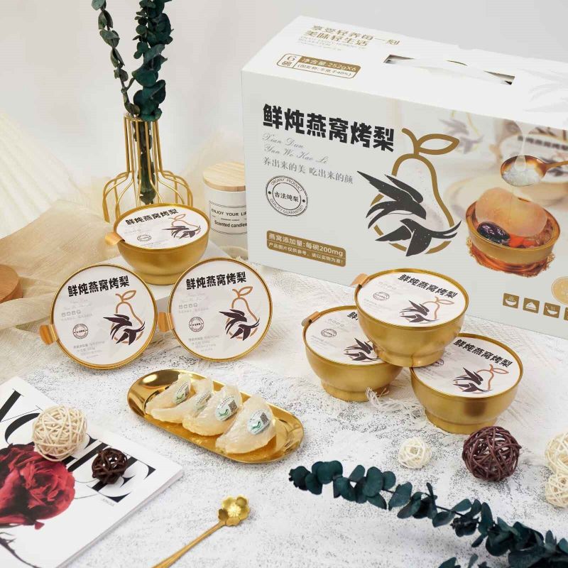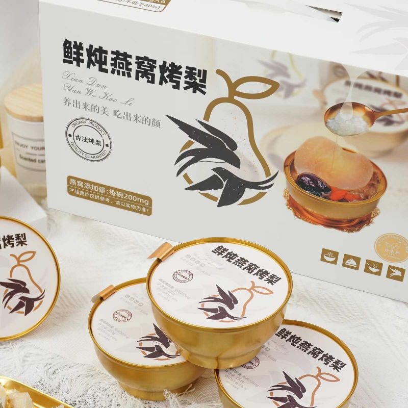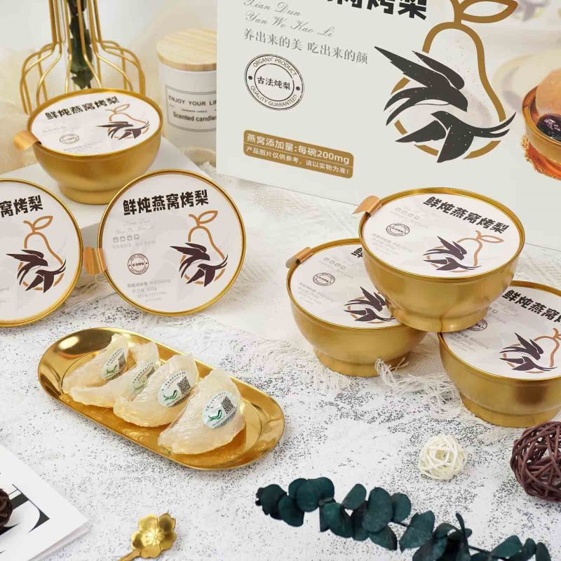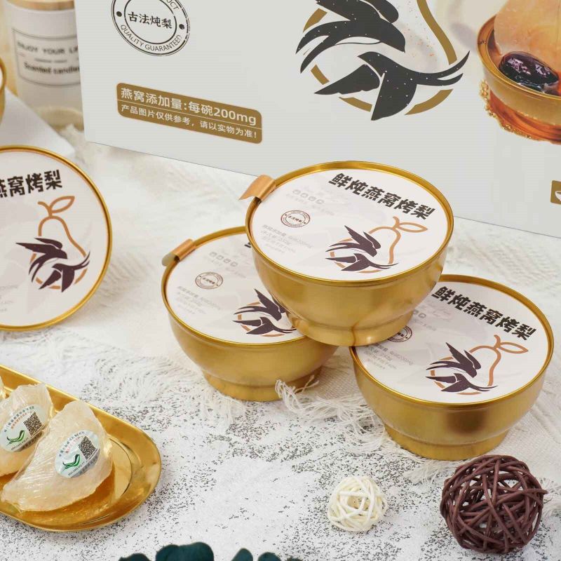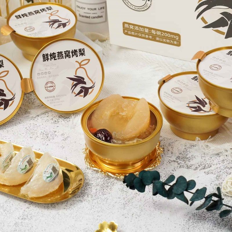 독특하고 맛있는 선물 상자인 구운 배를 곁들인 신선한 조림 새 둥지를 선보이게 된 것을 자랑스럽게 생각합니다. 신선한 제비집을 정성스럽게 끓인 뒤 찹쌀 카라멜로 구운 배와 능숙하게 섞어 식감과 맛이 두 배의 향연을 선사합니다. 그리고 절묘한 포장은 우아한 맛을 보여줍니다. 매 순간에 아름다움을 더해 선물하거나 자신을 위한 즐거움을 선사하는 탁월한 선택입니다.